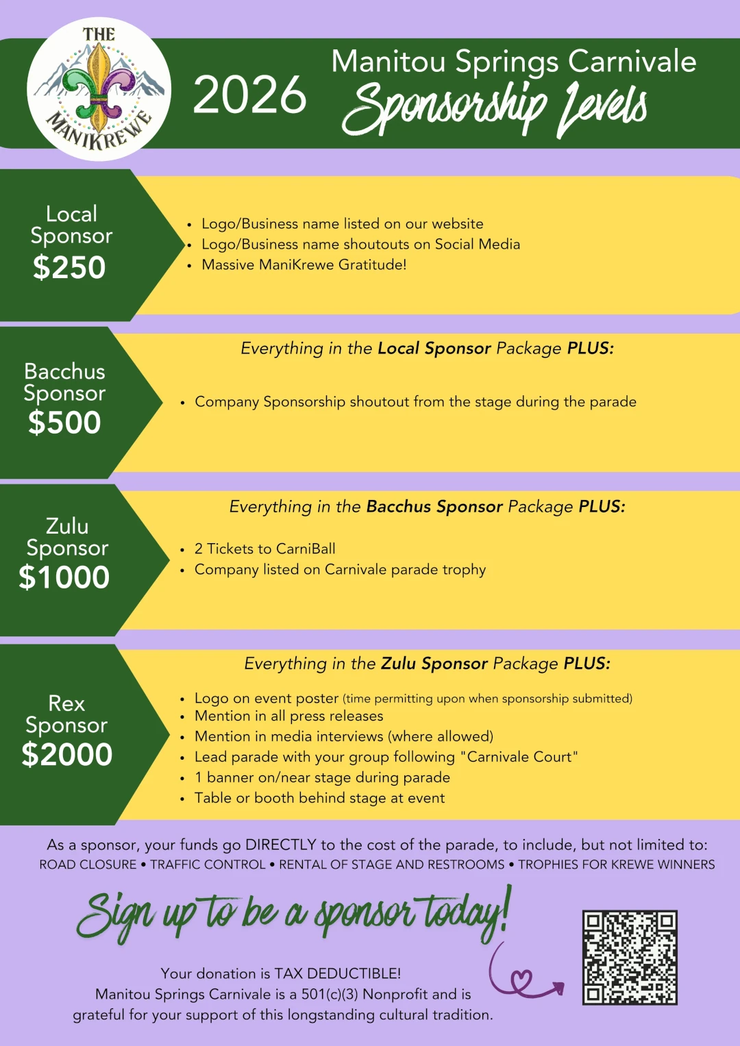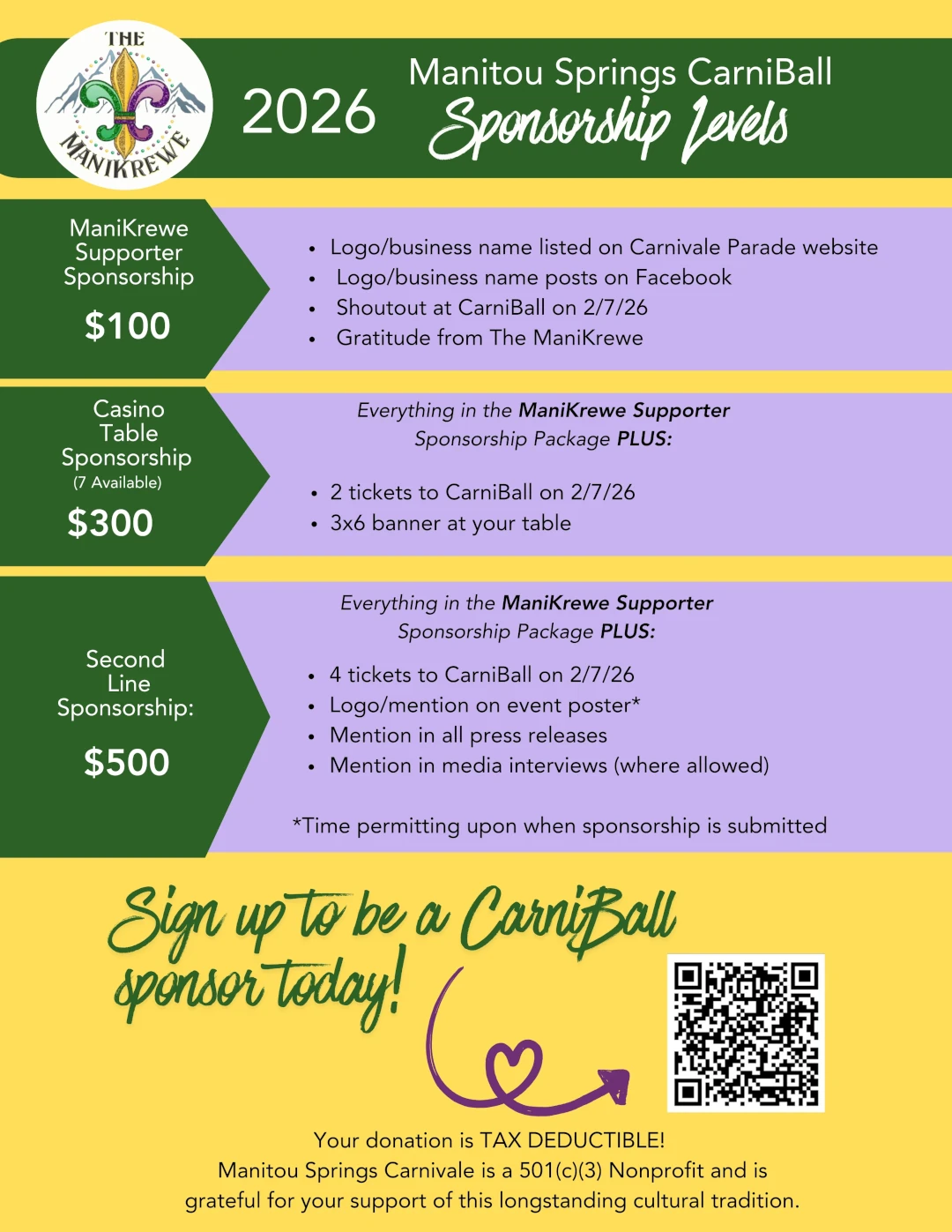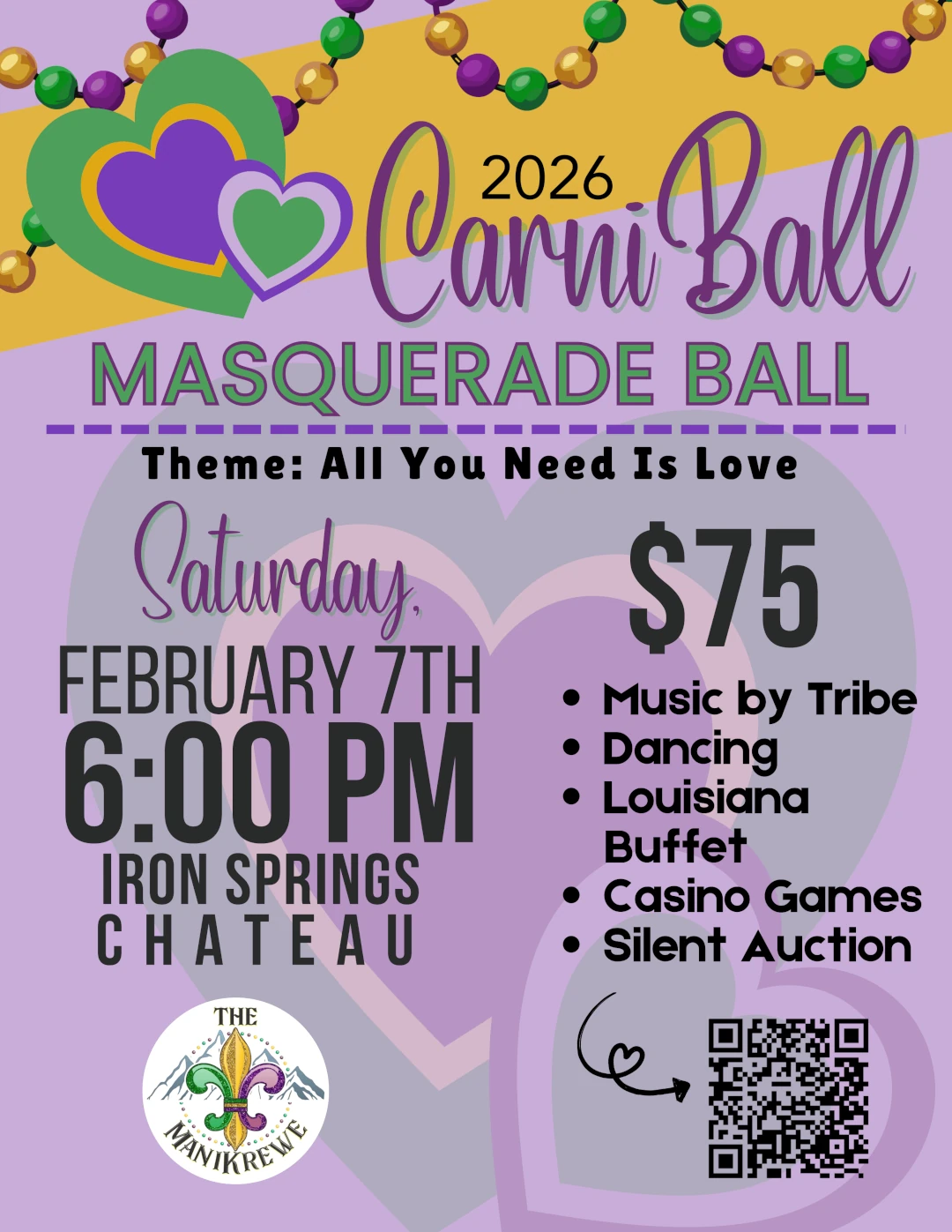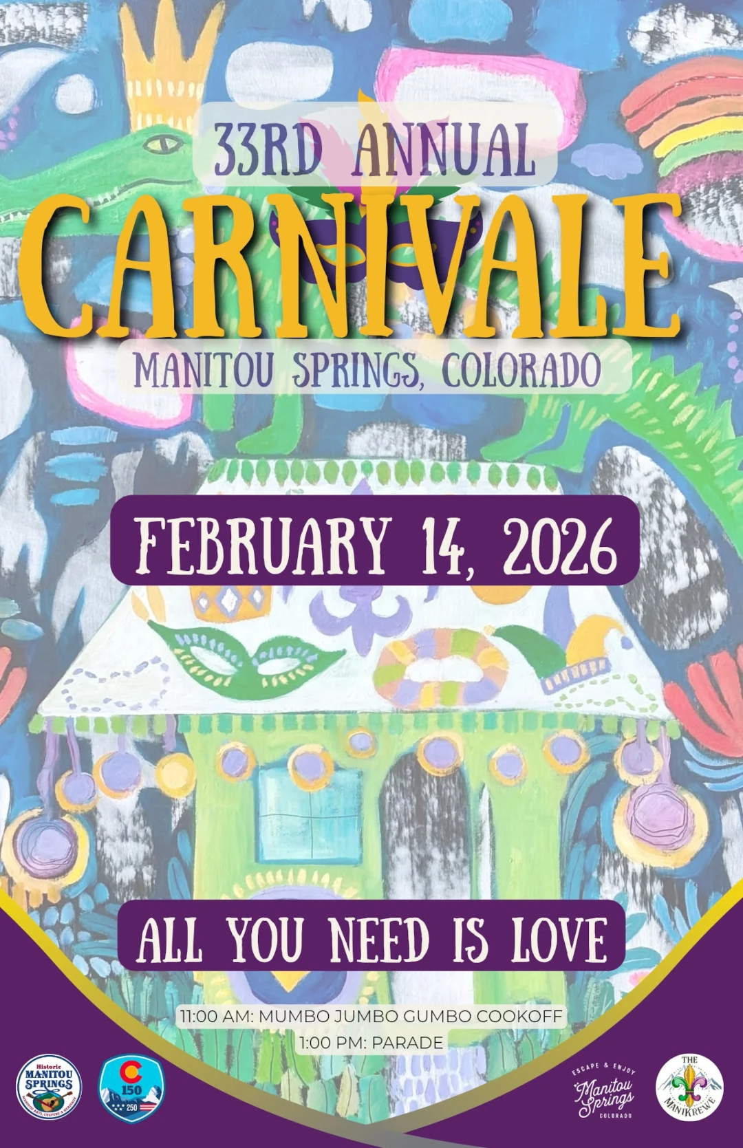 FOR IMMEDIATE RELEASE Contact: Laura Ettinger-Harwell Phone: 719-231-7202 Email: manitoucarnivale@gmail.com Come on Out for the Manitou Springs Carnivale Parade! Mardi Gras in Manitou is a family-friendly art event. Manitou Springs, CO, February 11, 2026—It’s time to gather up your family and friends, come on out and get in the Mardi Gras spirit at the 33rd Annual Manitou Springs Carnivale parade! Saturday, February 14, love is in the air and our theme, “All You Need is Love” will guide the parade this year. King Jason Wells and Queen Jenna Wells will lead the event, with the Manitou Springs Drum Circle behind, setting the tone and raising energy levels. Musicians, artists, krewes and GIANT PUPPETS march down Manitou Avenue, bringing beads, fun throws and an interactive art happening. The parade begins at 1pm at the 600 block of Manitou Avenue and ends at the Soda Springs Park Pavilion. Pro tip: Manitou Avenue closes at Old Man’s Trail and Manitou Avenue at noon. Come early, park in one of the lots downtown, enjoy breakfast at one of Manitou’s great restaurants, and THEN, check out the Mumbo Jumbo Gumbo Cookoff (a Visit Manitou Springs event) at the Soda Springs Pavilion. Gumbo by both amateur and professional chef can be sampled and you can vote for your favorite. If You Go: Parking Options